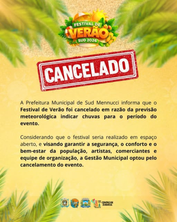A Prefeitura Municipal de Sud Mennucci informa que o Festival de Verão foi cancelado em razão da previsão meteorológica indicar chuvas para o período do evento.