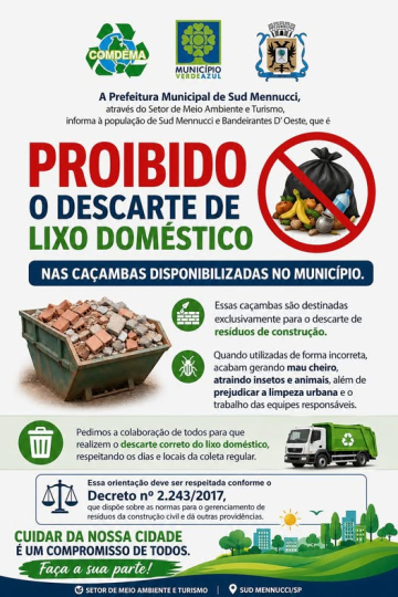 A Prefeitura Municipal de Sud Mennucci, através do Setor de Meio Ambiente e Turismo, informa à população de Sud Mennucci e Bandeirantes D’ Oeste, que é proibido o descarte de lixo doméstico nas caçambas disponibilizadas no município.